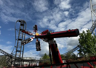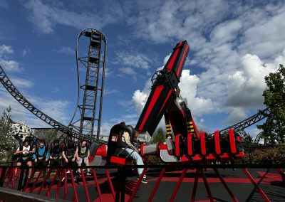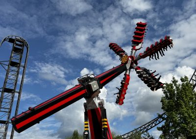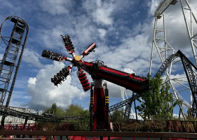 Situated at the very edge of Lost City, and just a stone’s throw distance from Saw – The Ride and Hyperia, Samurai sits waiting to take its 30 challengers into the sky. Once everyone is securely fastened in, the whole ride raises off the platform. It then spins around its central support column, and also on an axis at the end of the rotating gondola. On top of this, the 6 rows of seats flip and spin freely according to the angles they’re at, meaning Samurai offer a truly different ride every time!