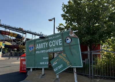 Amity, the first major area to be installed after The Tussauds Group purchased the park, is an example of how good the theming of a regional park can be. Set in the fictional village of Amity Cove, an American fishing community, which has been ravaged by regular Tidal Waves, actually created as the splash from the Tidal Wave ride.
