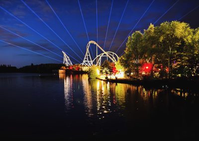 The on ride photo point is here, before the ride goes through a unique outerbank twisted dive: the train climbs 50m into the air, before twisting riders out to the left, whilst the train turns right. This then continues to turn the train upside down, before it then twists back down to the ground. In total, riders experience 4.2 seconds of airtime on this element alone! Many fans have tried naming this never-before-seen element, but both Thorpe and Mack feel “outerbank dive” is suffice, although internally within Mack, it was nicknamed the Kremer Roll, after one of the designers of the ride’s track layout, Maurice Kremer.