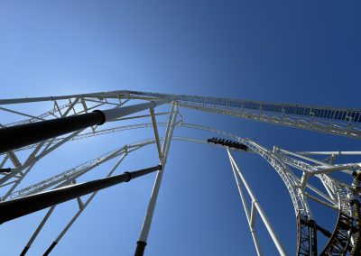 Having been so long since the park invested in a roller coaster, they took the “go big or go home” adage seriously, building the tallest coaster in the country, smashing the record that had been held for 30 years. This “hyper coaster” (a roller coaster between 200ft and 299ft) is unlike most traditional ones though, which usually have long, sprawling layouts and no inversions. Instead, Hyperia packs a series of fast-paced, hard-hitting unique elements gracefully one after the other, to really stand out from the crowd. It is also the first major – and inverting – roller coaster at the park to feature state-of-the-art lap bars, as opposed to over-the-shoulder restraints.