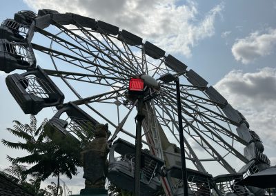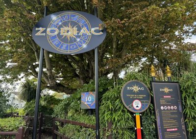Once securely locked into your pods, the ride starting and you rotate around the central axis. At first it’s like going in a high-speed roundabout, then suddenly the ride lifts up out of the ground on a central arm and sends riders spinning into the spies above. After two minutes, Zodiac begins to slow and the ride returns to its normal position, ready for its next batch of willing adventurers!