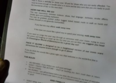 This was a lot more psychological, with The Director and his assitant trying to ‘pysch you out’, taunt and tease you, make you think this was the scariest thing ever. This was done whilst the final normal runs for the maze were finished. After the waiver was read and signed, The Director or his assistant would take (or potentially drag!) you to your maze. Depending on what maze you chose, this could take some time, and itself would be intense.